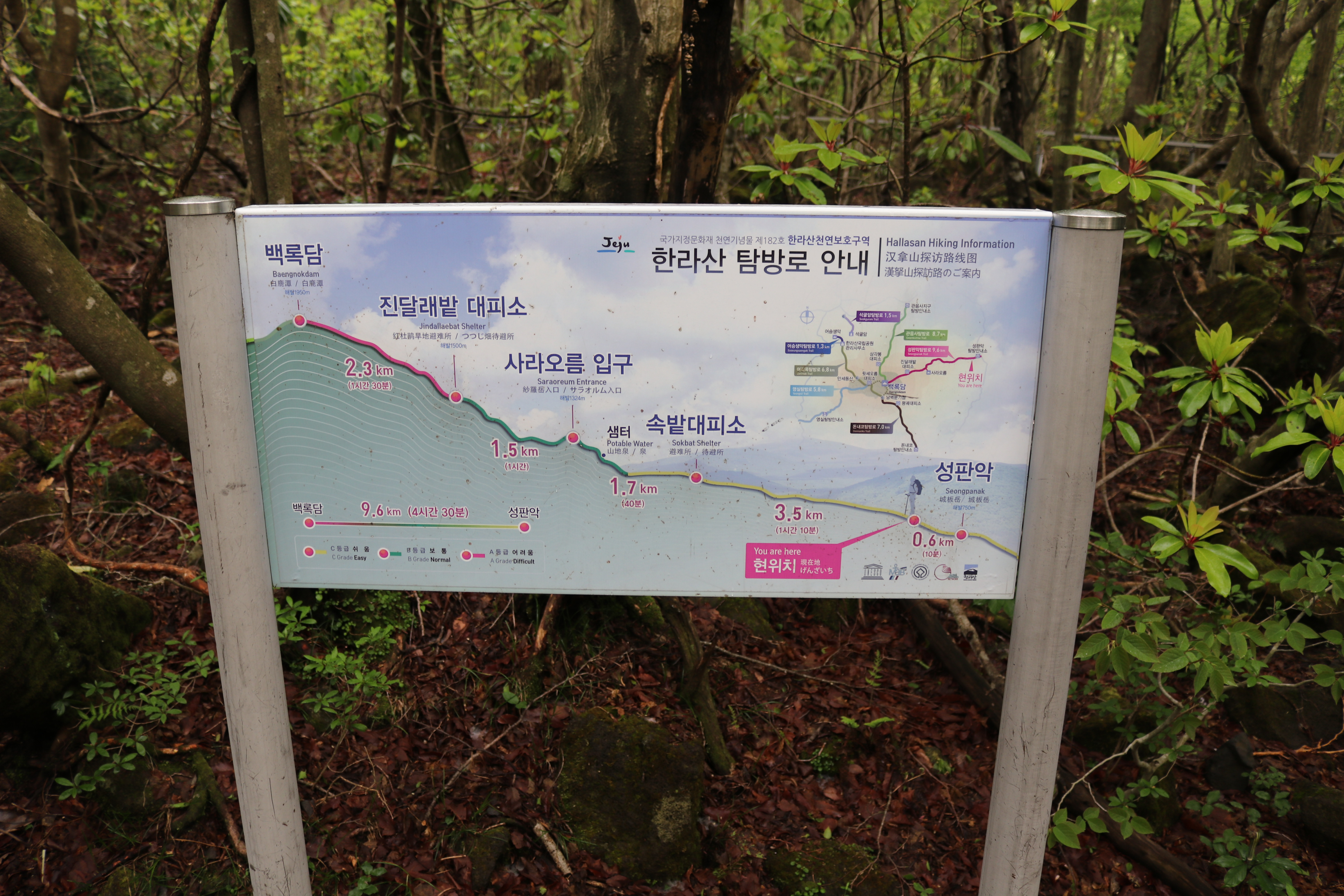 한라산 첫번째 대피소인 속달대피소는 해발 1,100미터에 위치하고 있었다. 제주도 한라산에는 자신의 등산 페이스를 확인할 수 있도록 이렇게 곳곳에 현재의 위치를 알려주는 표지판이 있어 편리했다.