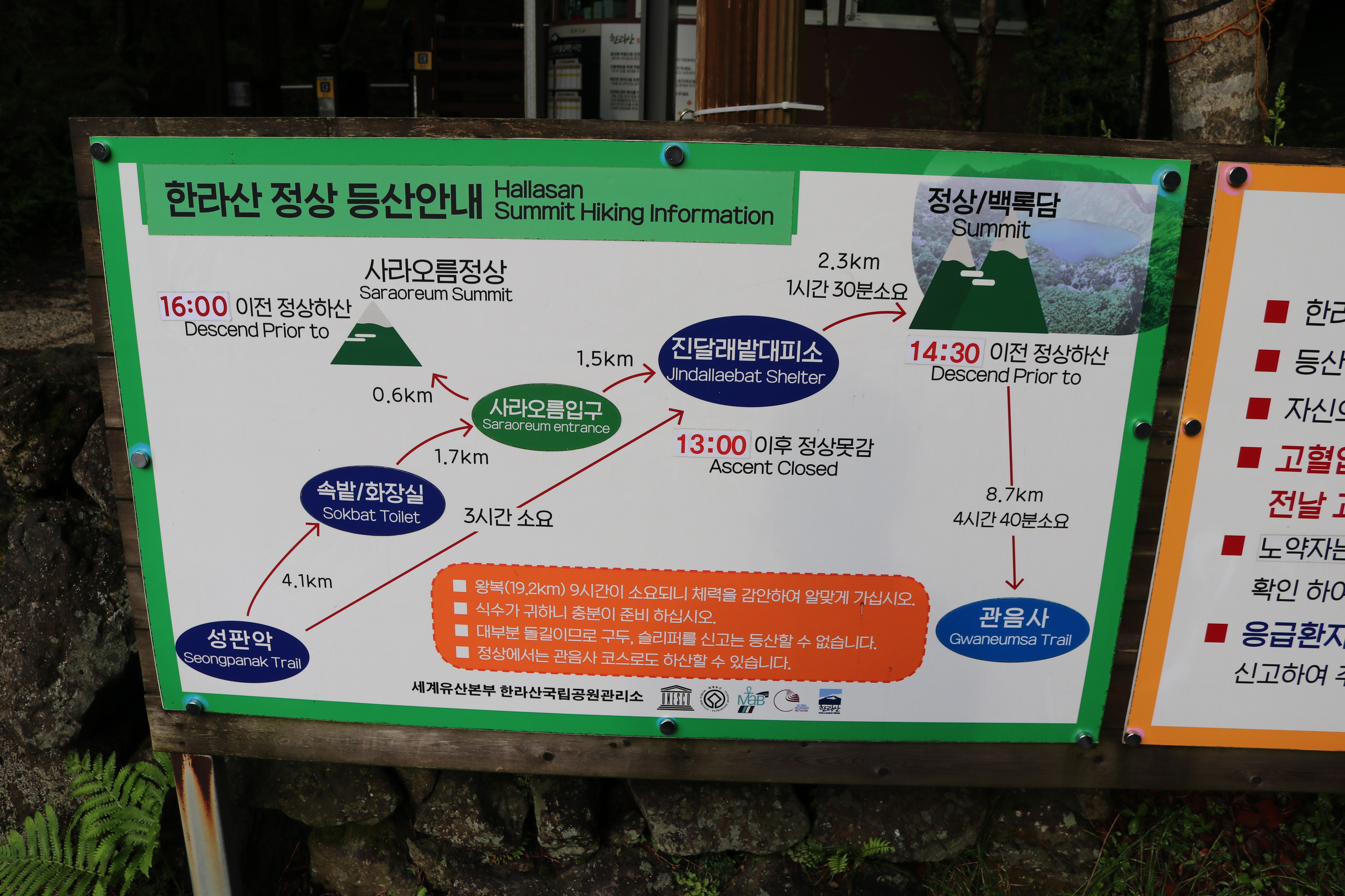 진달래밭 입구부터 성판악 입구까지는 꽤 힘든 코스이며 13:30부터 등산을 통제하고 있다. 따라서 백록담 정상까지 오르기 위해서는 쉬는 시간 감안하여 최소한 진달래밭 대피소에 13:00까지는 간다고 생각해야 한다.