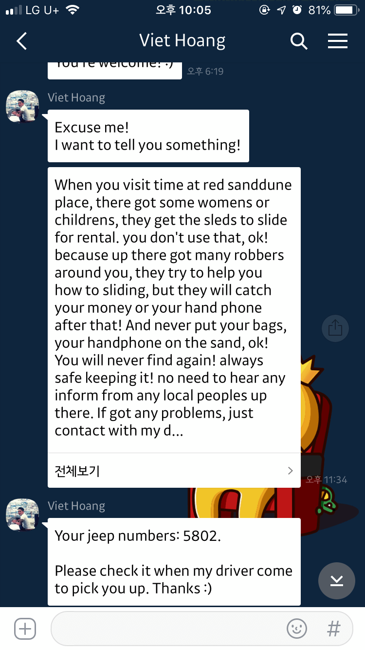 그러던 와중 호치민 공항에서 무이네로 밴을 타고 바로 이동할 수 있다는 사실을 알게 되었다. 밴을 타면 2~3인의 경우 80$에 가능했는데, 참고로 현지 밴 예약 카카오톡 아이디는 22557979이다.