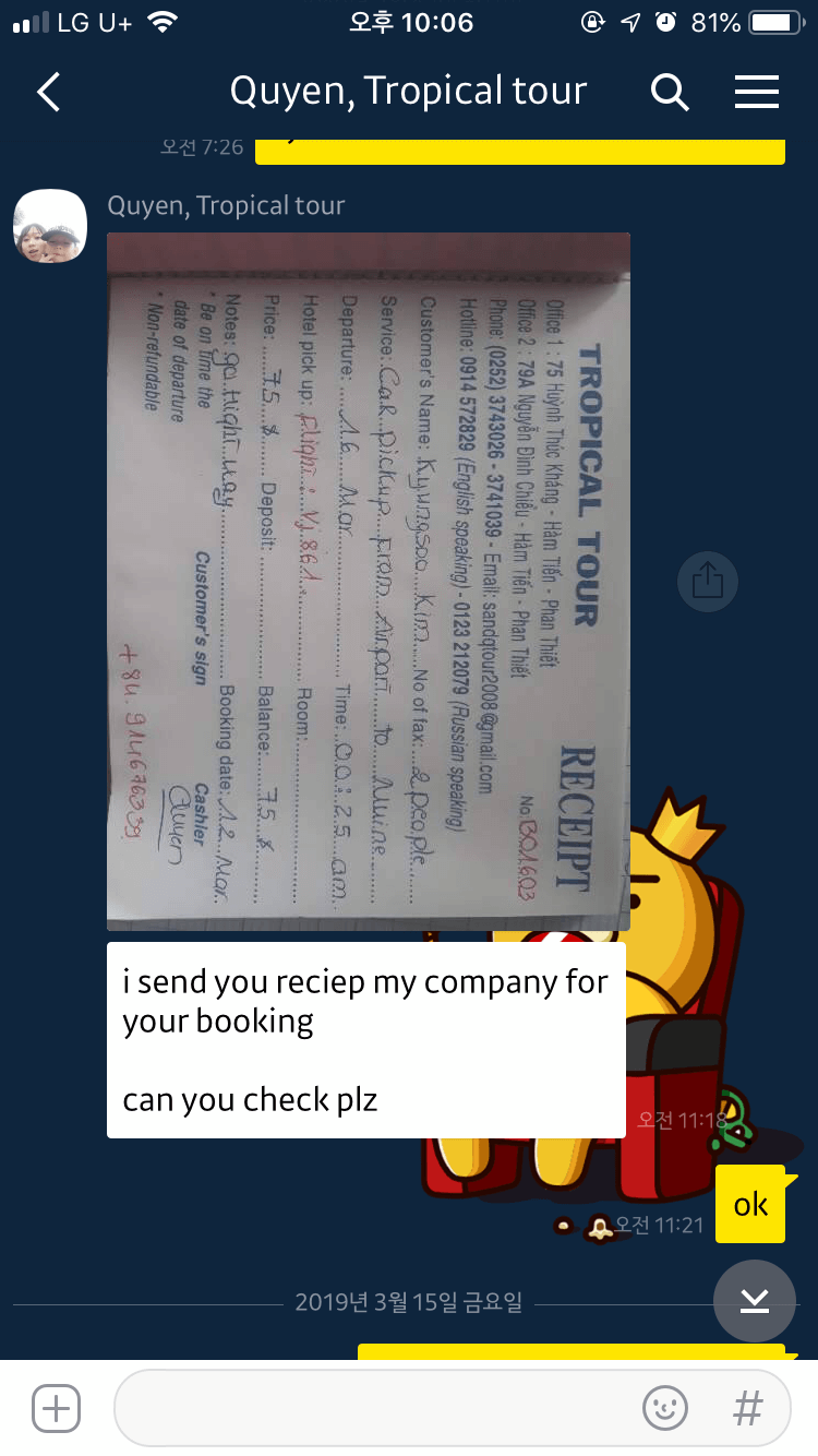 호치민 여행으로 무이네를 방문해서는 선라이즈 투어를 신청했다. 신투어 라는 현지업체를 이용했는데, 위의 사진처럼 카카오톡으로 연락해서 예약을 할 수 있었다.