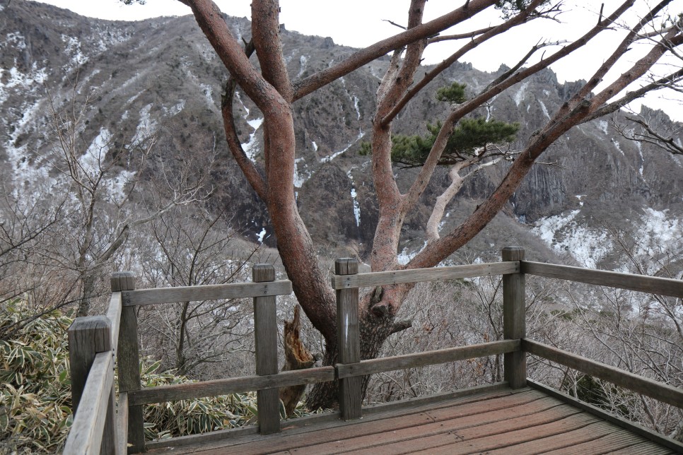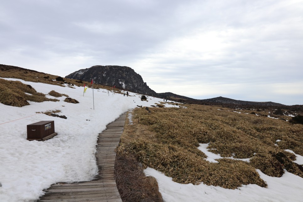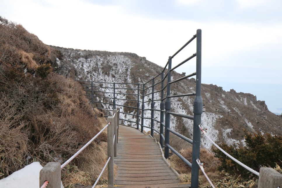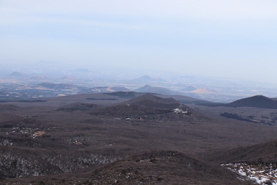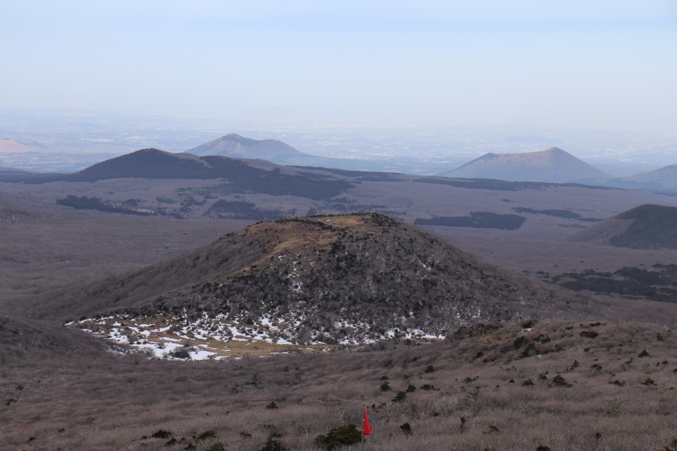 가파른 나무데크 오르막길을 걷고 나면 등 뒤로 한라산의 아름다운 모습이 펼쳐진다. 눈이 쌓인 모습이었더라면 정말이지 절경이었을테지만 그래도 뻥 뚫린 시야로 시원함을 만끽할 수 있었다.
