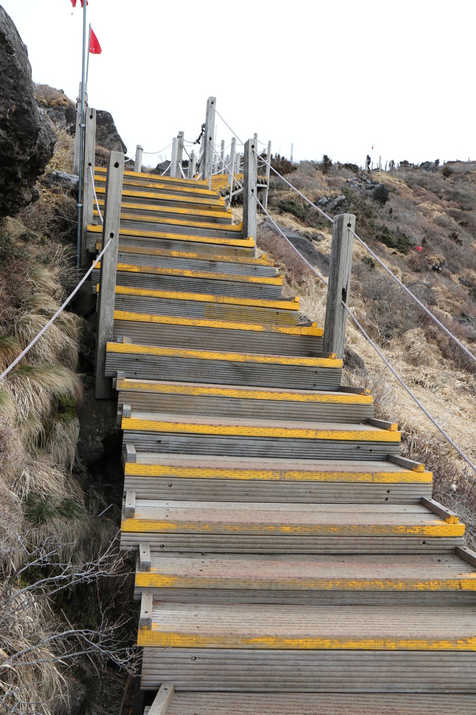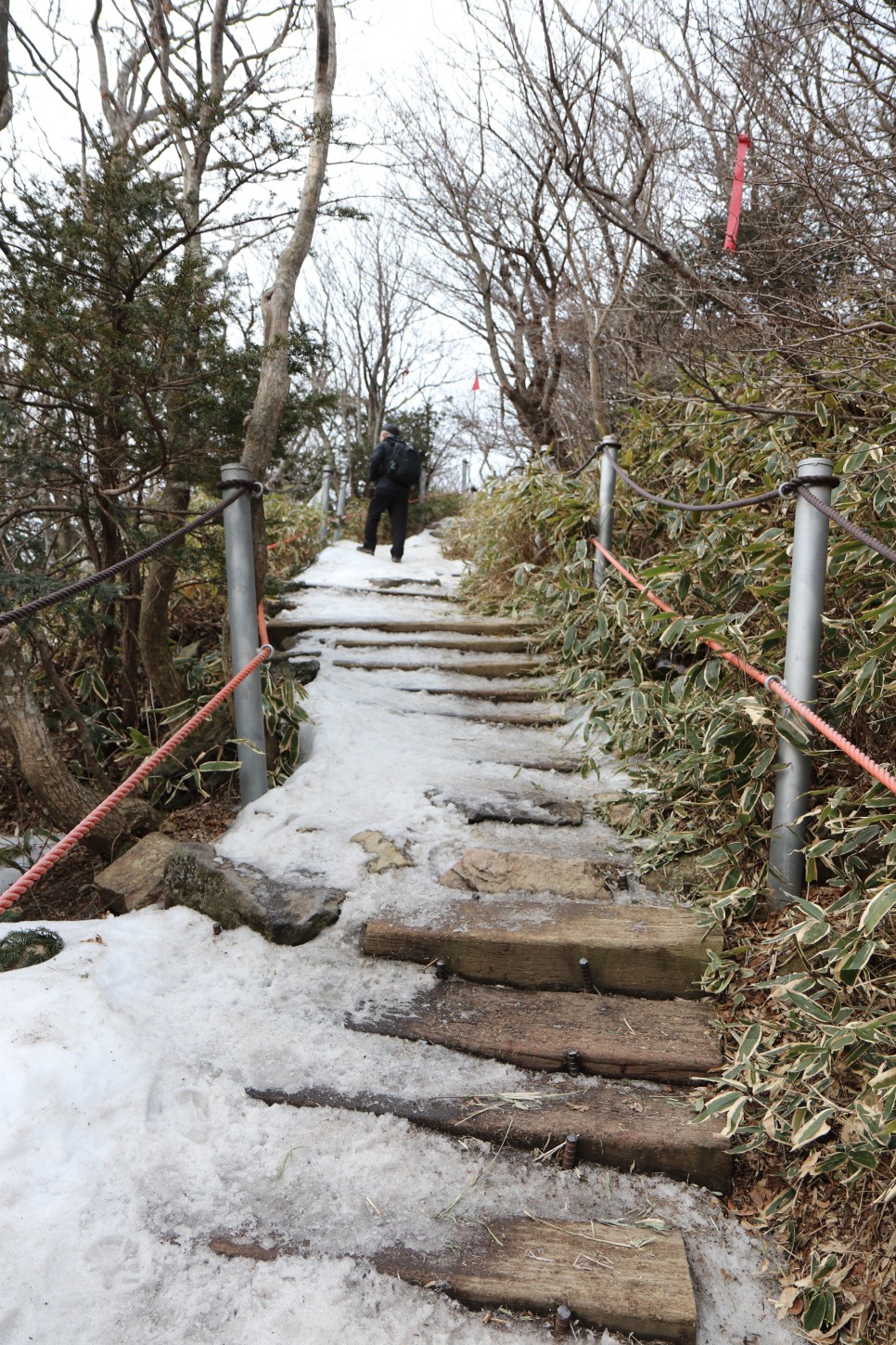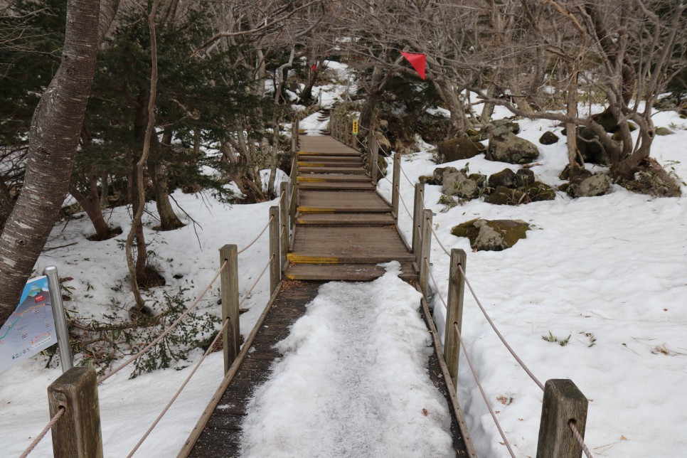 나무데크 길을 오를 때 아이젠이 망가져서 신경쓰여 벗어버리기로 했다. 그리고 지난번 성판악 코스를 오를 때 상당한 도움이 되었던 등산 스틱은 거의 사용하지 않았다. 당시 네발로 기어 올라갔을때와 달리 여기서는 별로 힘이 들지 않아서 꺼내지도 않았다.