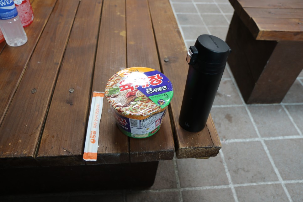 윗세오름에서 인증샷을 찍은 뒤 대피소 안으로 들어와 가방 안에 있던 컵라면을 꺼내 먹었다. 보온병에 따뜻한 물을 담아와서 먹었는데 역시나 대피소에서 먹는 라면의 맛은 감동 그 자체였다.