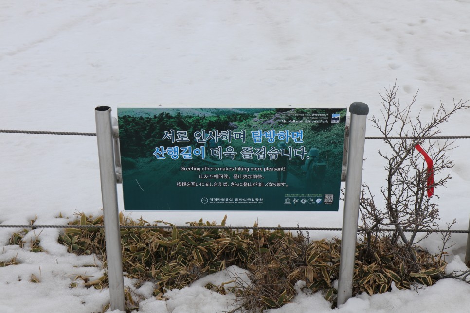 눈이 쌓여 가려진 팻말의 높이를 보아 유추해보니, 이 길은 눈이 쌓이고 쌓여 만들어진 길인 듯 했다. 서로 인사하며 탐방하면 더욱 즐거운 산행길이 된다는 문구처럼, 지나가는 사람에게 큰 소리로 인사하면서 지나가는 등산객들도 종종 볼 수 있었다.