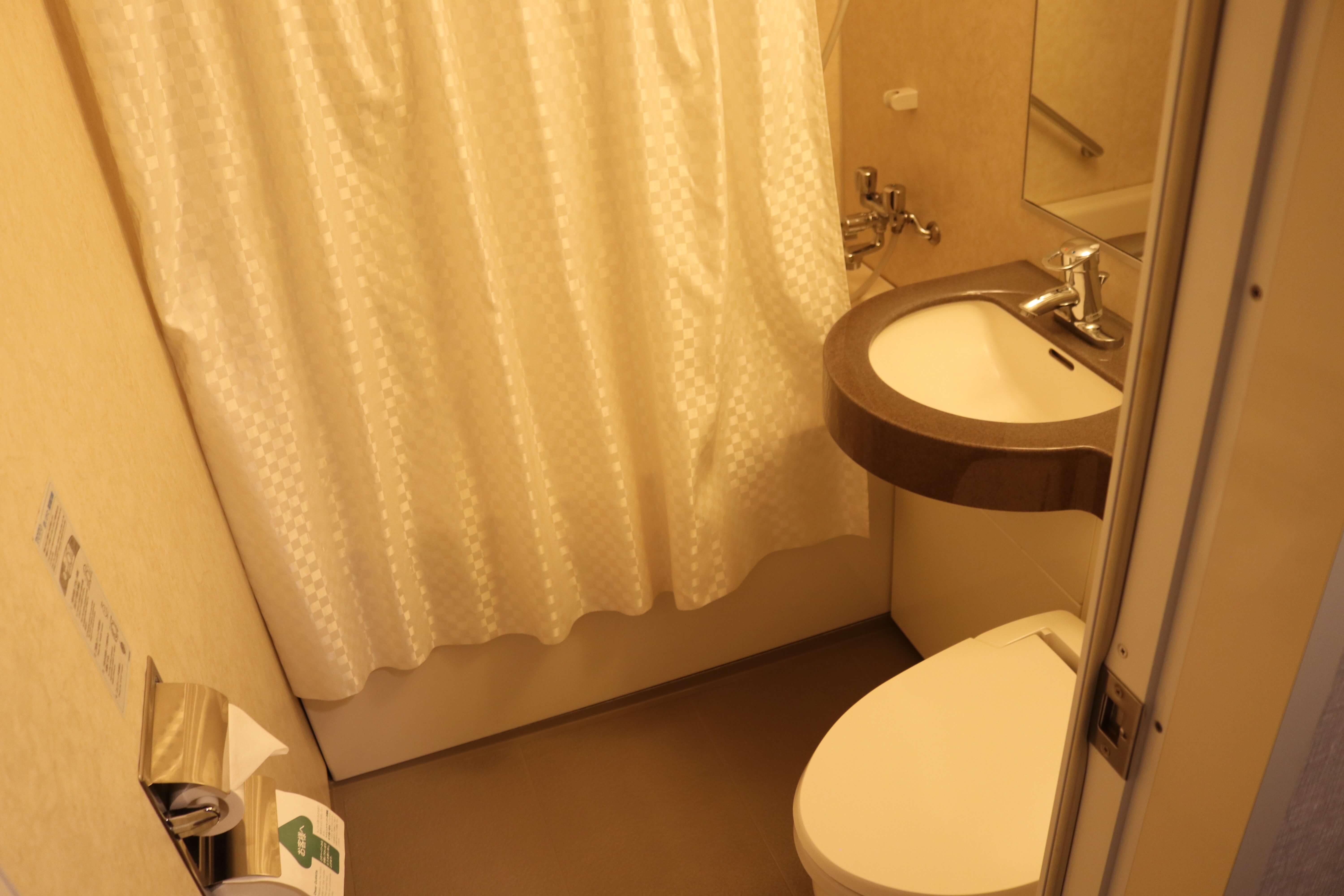 방의 크기 만큼이나 화장실도 비좁은 편이었다. 욕조에는 물이 튀지 않도록 커튼이 설치되어 있었는데, 바닥 배수구가 없으니 샤워를 할 때 유의해야 한다.
