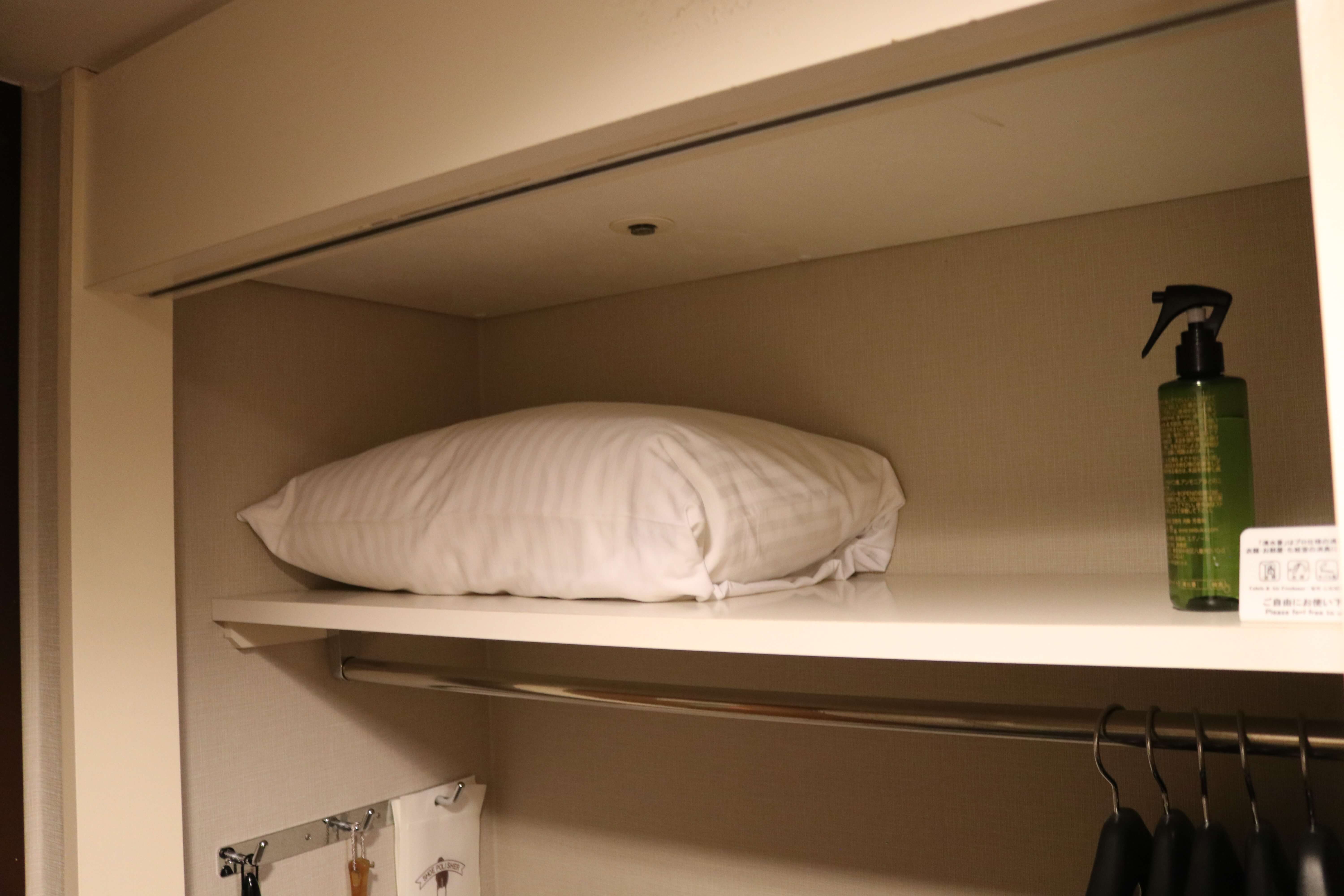 한켠에는 깔끔한 옷장도 마련되어 있었다. 위쪽으로는 여분의 베게가, 아래쪽으로는 다리미 바침대와 함께 일회용 슬리퍼가 구비되어 있었다.